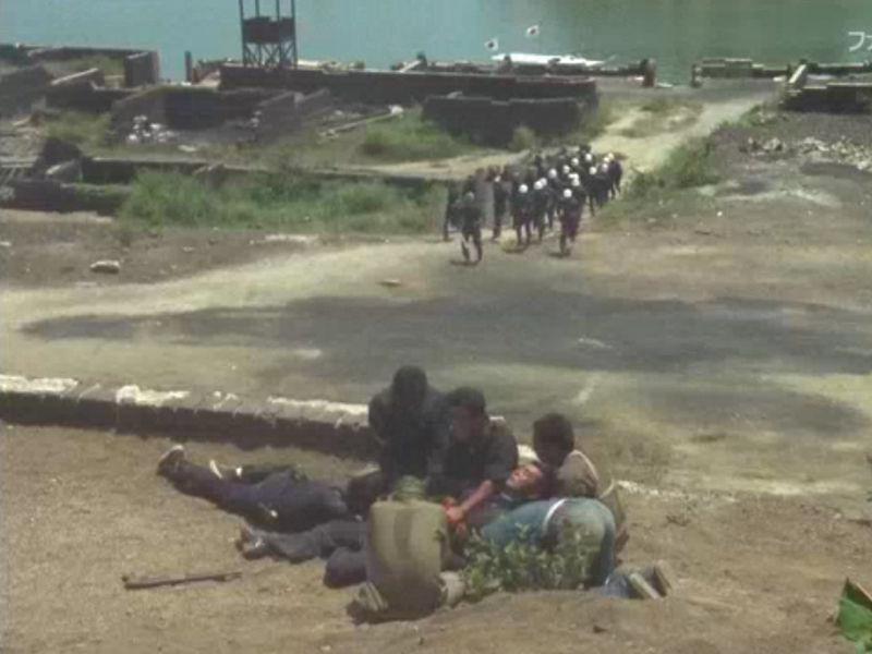 要塞側から見た「犬島」に乗り込んだ大門軍団。
